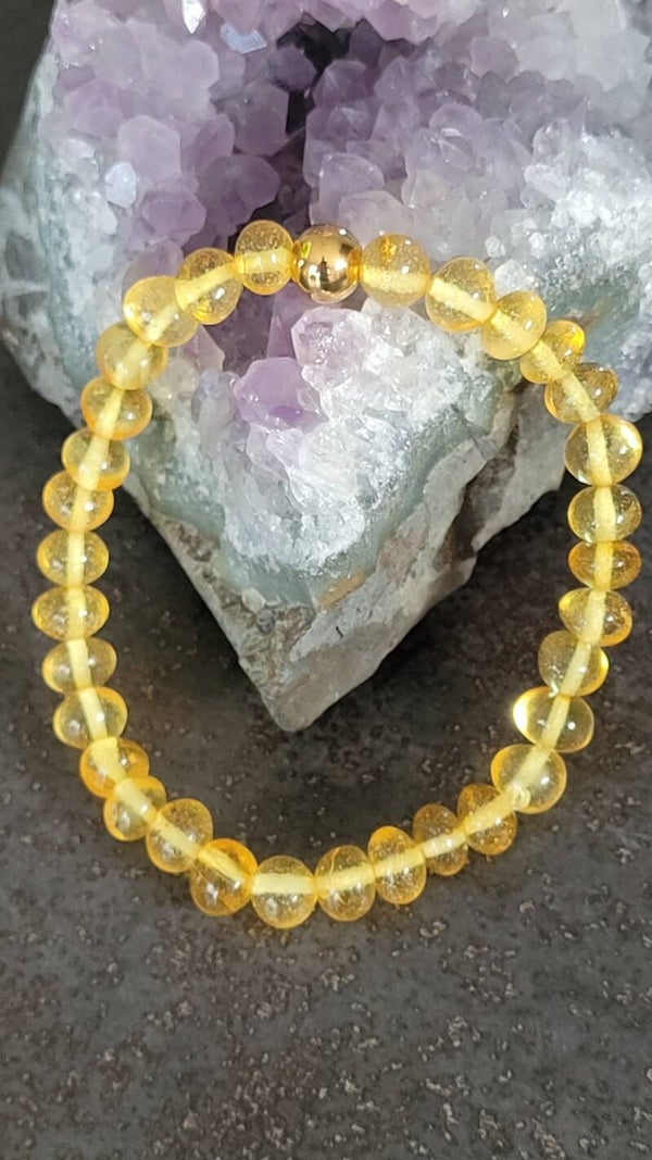 30 perles roulées d'Ambre jaune or et une perle dorée en acier inoxydable.