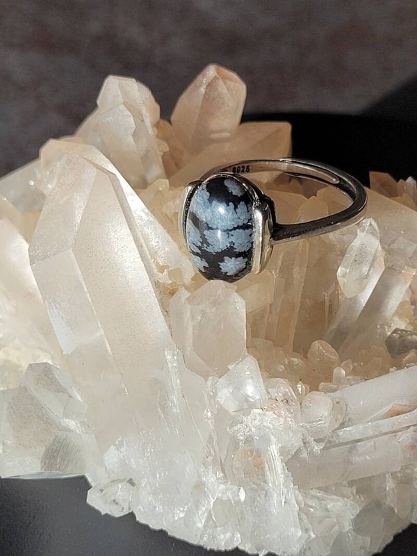 Pierre d'Obsidienne Neige montée sur un support en argent 925 Réglable . Poids: 5g.