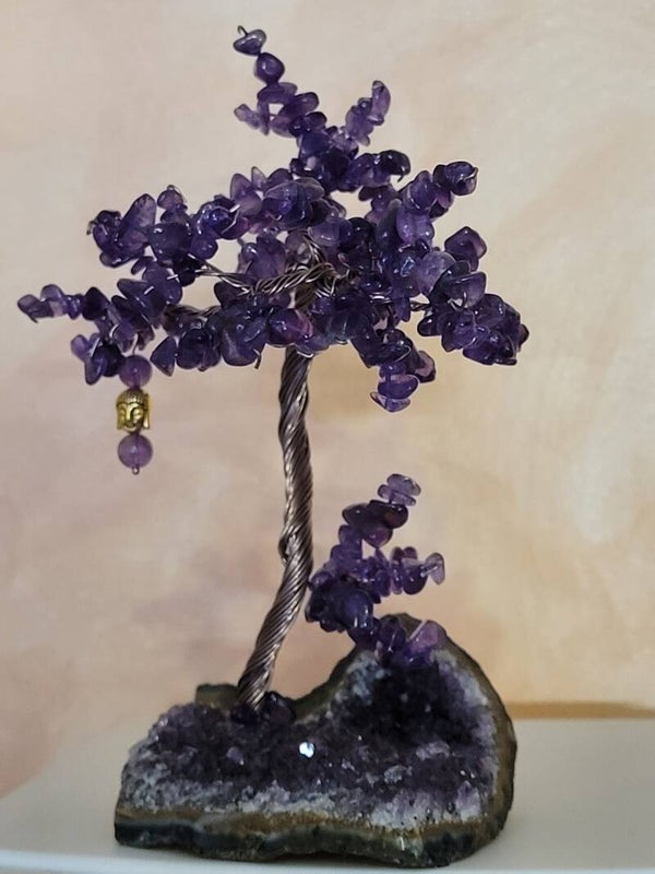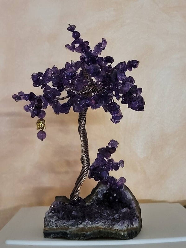 Arbre de vie composé de perles chips d'Améthyste et sur un socle en cristaux