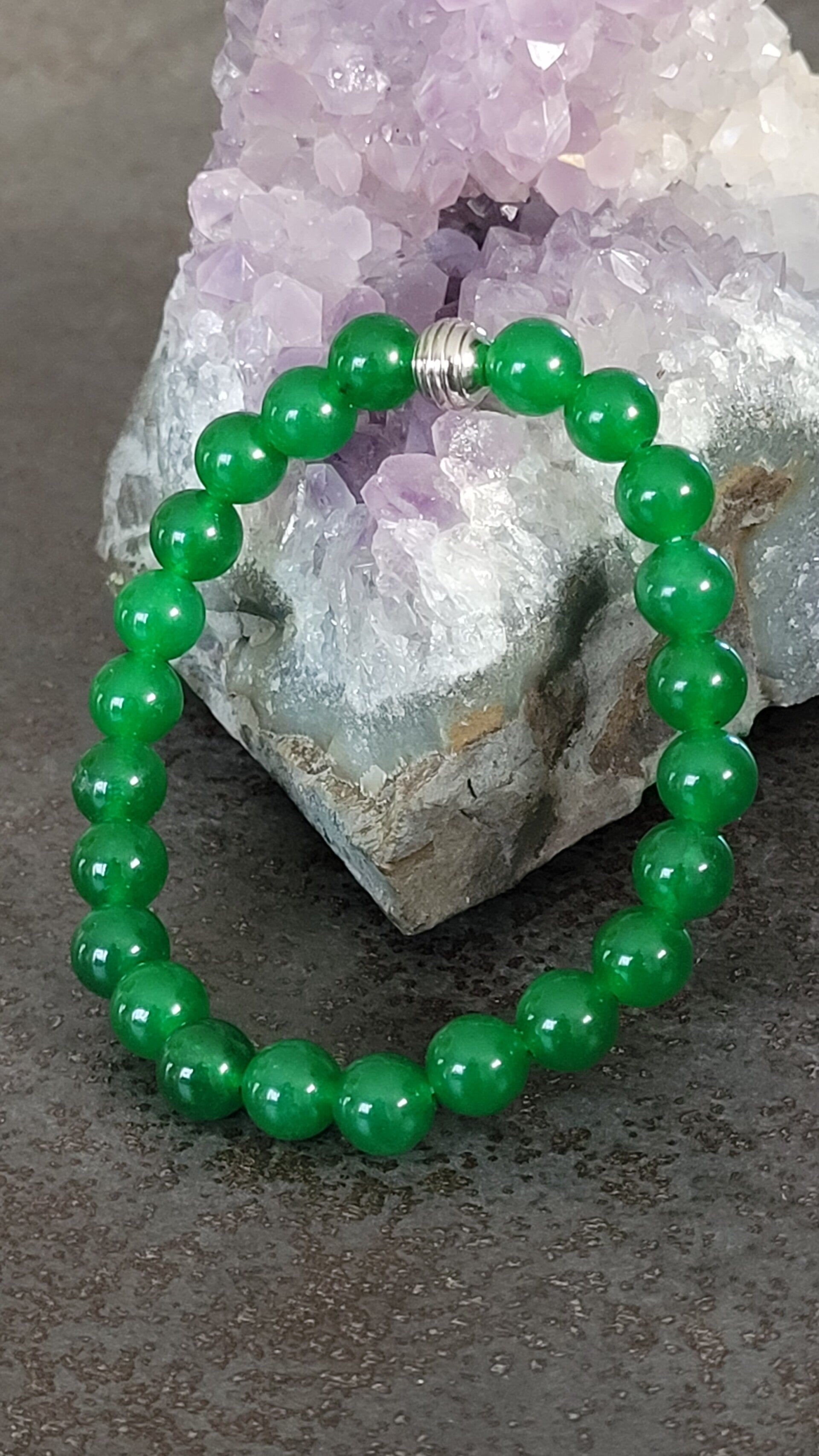 1 Bracelet de Jade vert 8mm , 23 perles en pierre naturelle et une perle argenté inoxydable. ( Tour de poignet 18,4 à 19,4 cm environ).