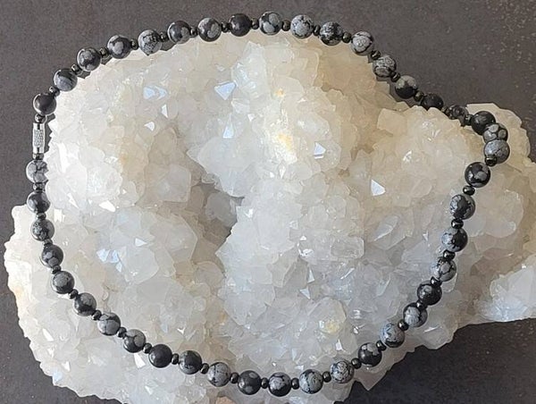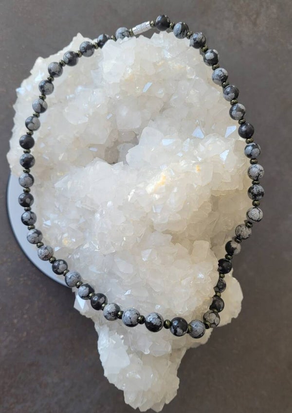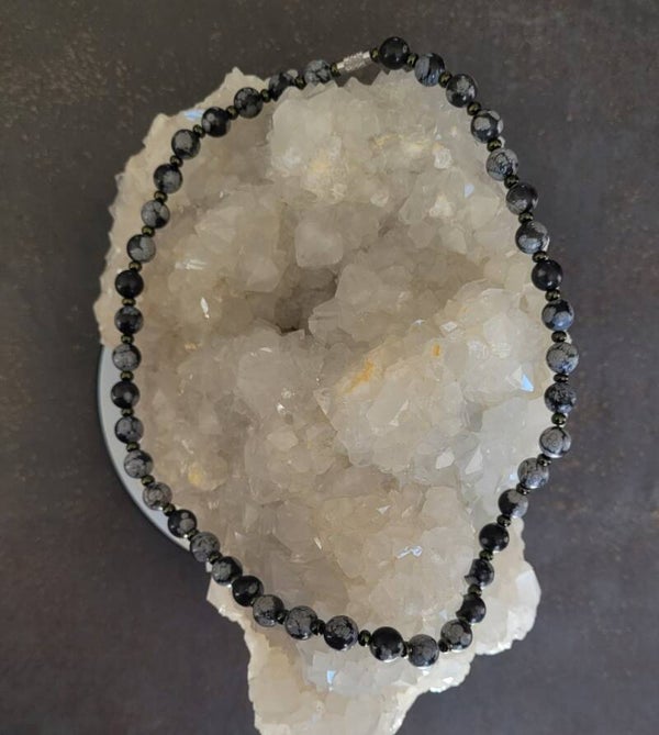 1 Collier de 42 perles d'Obsidienne Neige 8 mm en pierre naturelle et de 43 perles intermédiaires noires reflets verts de 4mm.